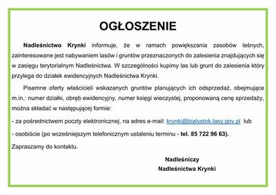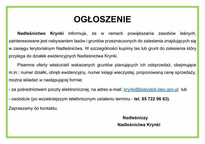 Nadleśnictwo Krynki informuje, że w ramach powiększania zasobów leśnych, zainteresowane jest nabywaniem lasów i ...